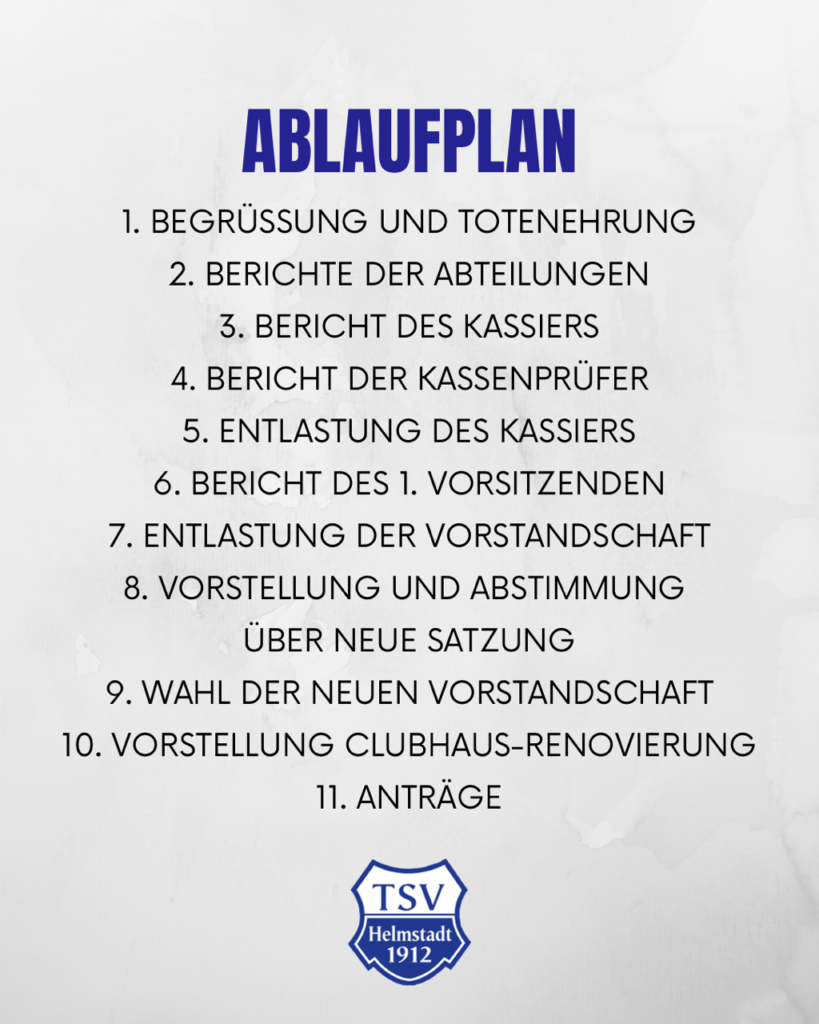 Die diesjährige Mitgliederversammlung des TSV Helmstadt findet am Freitag, 20. März 2026 um 19:00 Uhr im Vereinsheim statt.
