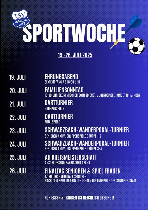 Alle zwei Jahre veranstaltet der TSV seine traditionelle Sportwoche. Im Rahmenprogramm findet auch wieder das Schwarzbach-Wanderpokal Turnier für Senioren-Mannschaften statt. Die teilnehmenden Mannschaften nutzen das Turnier als ersten Härtetest für die bevorstehende Verbandsrunde.